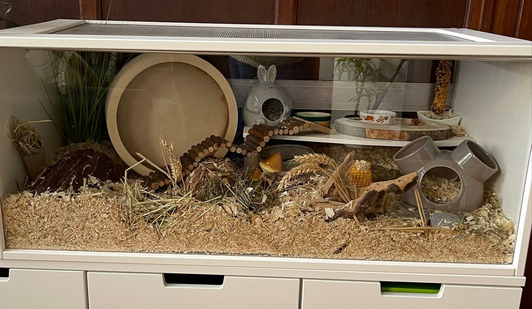 Ein Hamstergehege sollte ein Mindestmaß von: 1 m x 0,5m x 0,5m haben. Natürlich auch gerne größer.